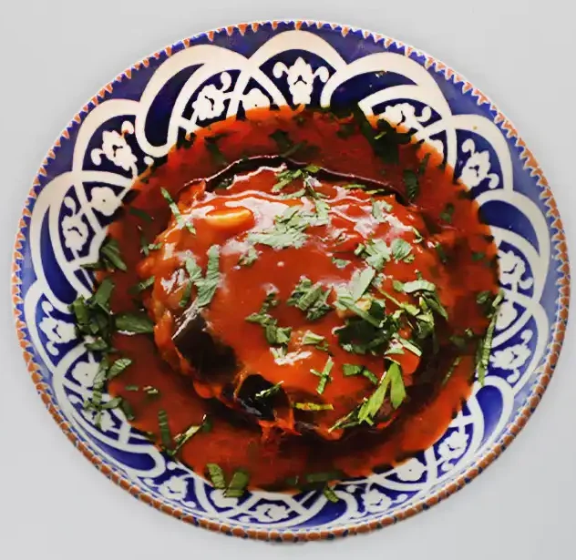 חציל במילוי בשר עגל קצוץ ברוטב עגבניות וכוסברה