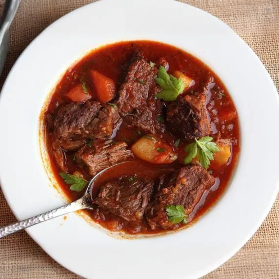 קוביות בשר מלווה בירקות שורש ברוטב אדום