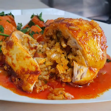 כרע עוף עסיסית במלית אורז ובשר קצוץ בתיבול השף בגריל