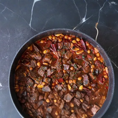 בשר ראש עם חלקי פנים ברוטב מזרחי עם חומוס ופלפלים